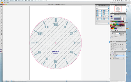 今回は文字盤ごと変身させます。illustratorで図案を製作します。材料は消銀テトロン素材(裏糊付き)を使用します。地模様を選び、インデックス(文字盤の目盛りと数字)にグロス加工、印刷と同時にカット加工の設定をして当社のUVインクジェットプリンターで出力します。