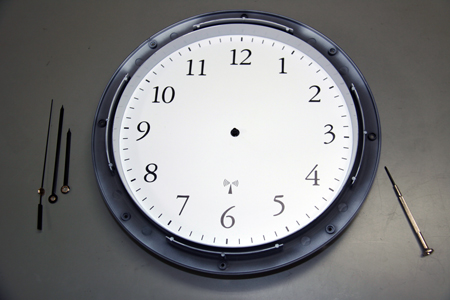 秒針、短針、長針を順番通りに曲げないよう気をつけて外し、位置をしっかり合わせて文字盤にステッカーを貼付けます。